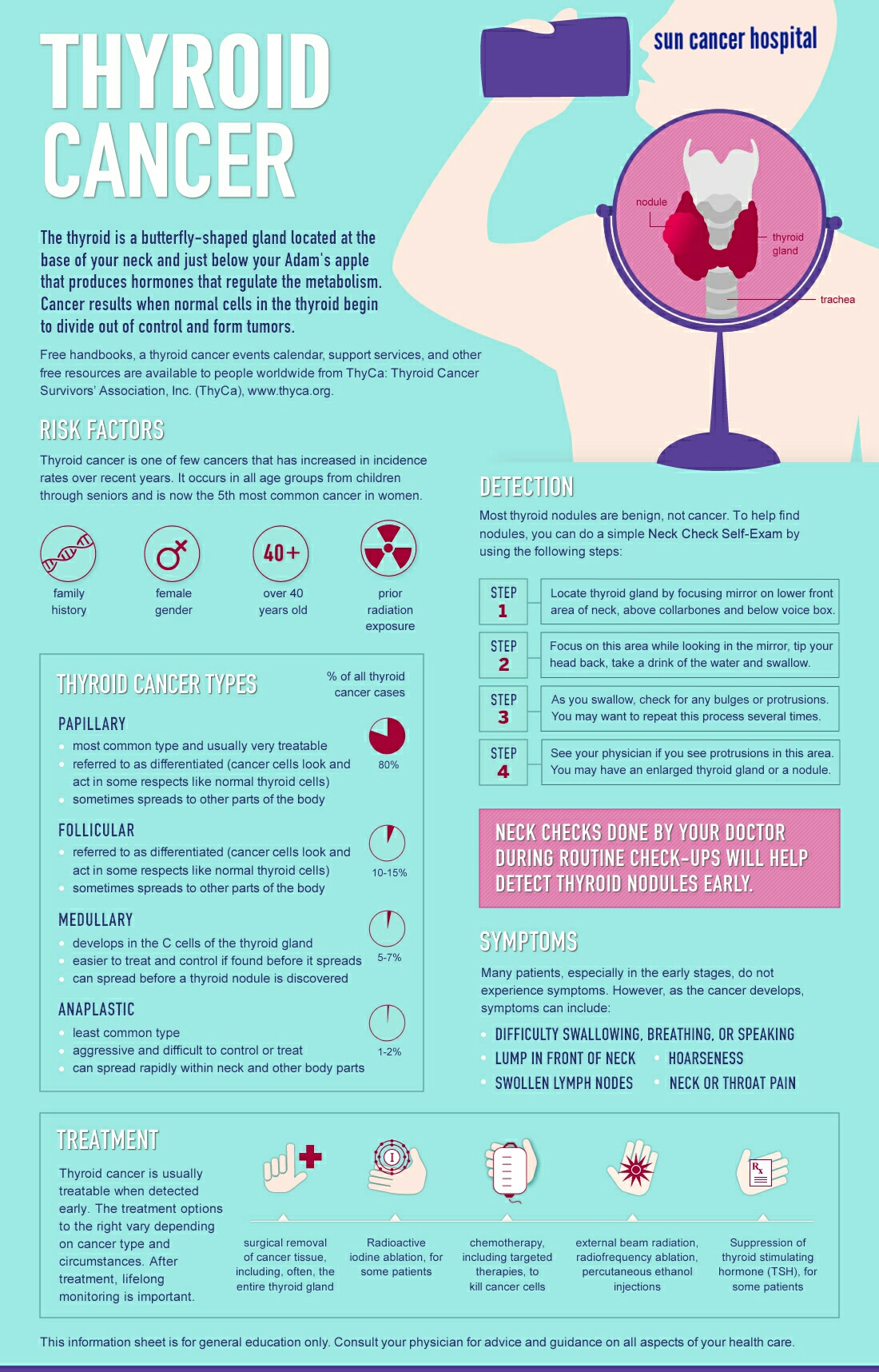 Thyroid cancer is most common endocrine malignancy Prevalence is 3.7/100000 Women are more affected then men (3:1) Most common age group is 50 years 90% presents as solitary thyroid nodule 5 % of all solitary thyroid nodules are malignant. Well differentiated thyroid malignancy are common and have excellent prognosis & survival around 90 % Over 10 years. FNAC which is used to confirm diagnosis has 70 to 90% sensitivity & cannot differentiate between certain benign and malignant disease where diagnostic lobectomy becomes necessary. Early sign include swelling in neck Change of voice, difficulty in swallowing or Breathlessness are features of advance disease. Early diagnosis and prompt treatment are key to good survival for these curable diseases.